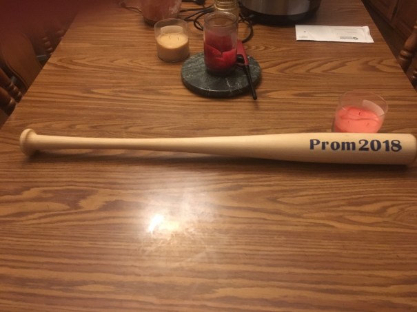 The Seniors had been planning, and need I say scheming to make sure Connor was at Prom in spirit. Krystal and Courtanie had the carpentry shop make this bat, CAD engraved the writing on it, and Courtanie painted the letters.